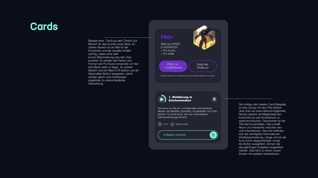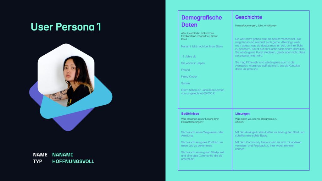 Ein benutzerzentrierter Designansatz wurde angewandt, um die oben genannten Herausforderungen zu bewältigen. Dies beinhaltete die Erstellung von User Personas und Nutzungsszenarien, die dazu beitrugen, die Lösung direkt auf die Nutzerbedürfnisse auszurichten. Weiterhin wurde entschieden, Grundkurse kostenlos anzubieten und unterstützende Funktionen wie „What to draw next“ und Referenzmaterialien zu integrieren, um das Nutzer Engagement und die Lernerfahrung zu verbessern.