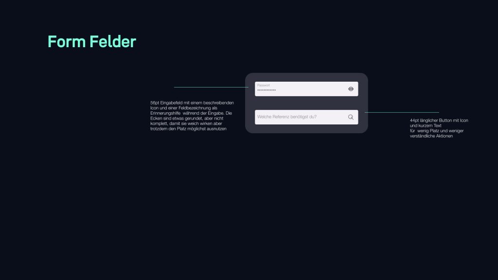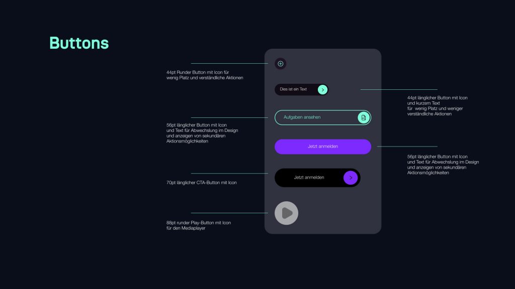 Das visuelle Design der App folgt den Prinzipien „Künstlerisch“, „Modern“ und „Farbig“. Um eine durchgehend ansprechende visuelle Ästhetik zu gewährleisten, wurde ein neues Icon-Set entwickelt, basierend auf einer Strichstärke von 1,5pt und einer Rastergröße von 24pt. Um eine optimale Lesbarkeit zu gewährleisten, wurde die Schriftart DIN Pro für Fließtexte und N27 für Überschriften ausgewählt. Diese Elemente halfen, einen modernen, technischen Look zu erzeugen, der sowohl professionell als auch spielerisch wirkt.