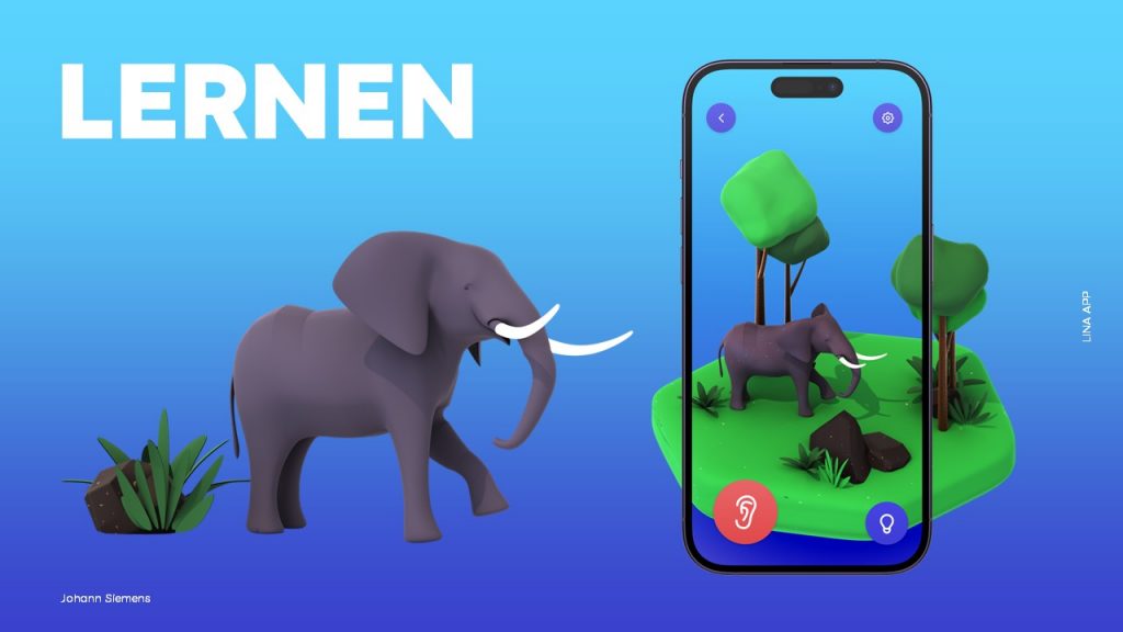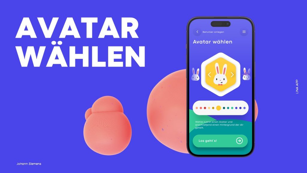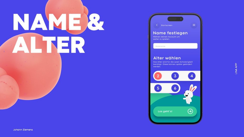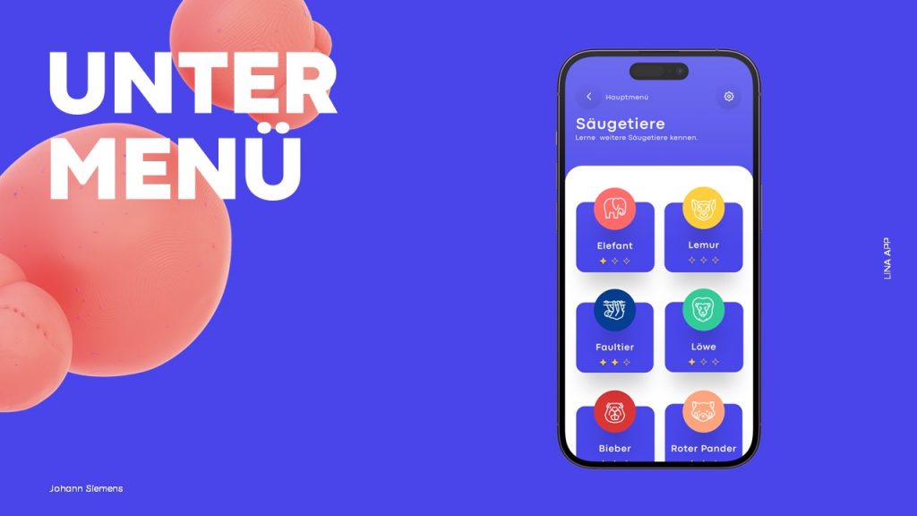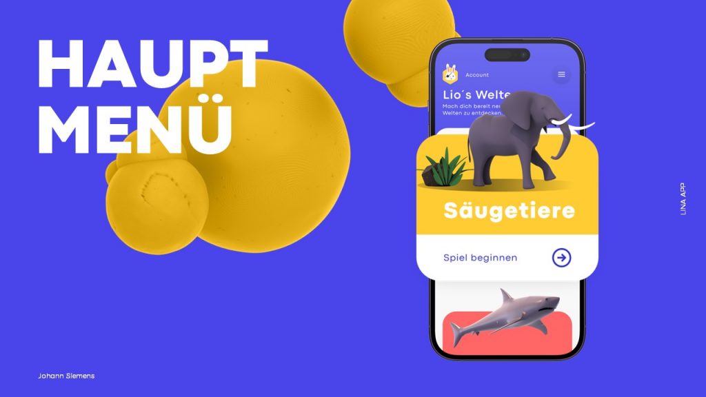 Die Konzeptfindung begann mit umfangreicher Forschung und Marktanalyse. Durch eine Online-Umfrage unter Eltern konnte ich ihre Präferenzen und Bedenken besser verstehen. Diese Erkenntnisse flossen in das Konzept der App „Lina“ ein, wobei das Maskottchen Lina als zentrales Element fungierte, um die Aufmerksamkeit der Kinder zu wecken und das Lernen zu erleichtern. Mit Low-Poly-Grafiken und leuchtenden Farben wurde eine intensive Interaktion und Engagement der Kinder angestrebt.